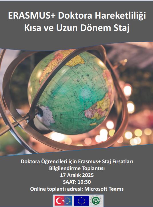 Doktora öğrencilerimiz için 17 Aralık 2025 Saat: 10:30'da çevrim içi Erasmus+ staj hareketliliği bilgilendirme toplantısı yapılacaktır. Toplantıya kayıt yaptırmak için tıklayınız.
